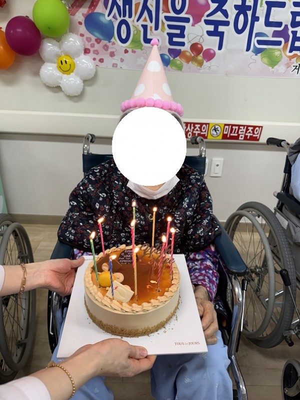고깔모자를 쓰시고 케이크 촛불을 한분씩 끄셨는데 너무 초를 잘 부셔서