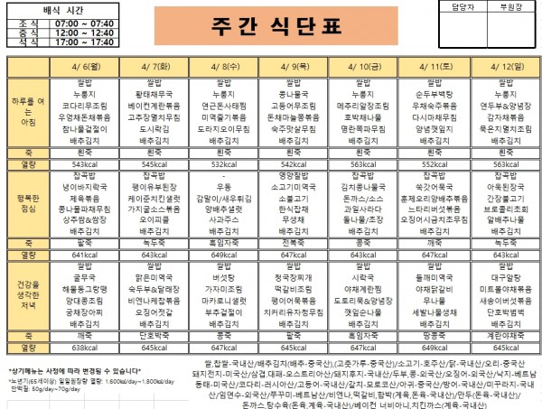 26년 4월 2주 거제요양병원 식단입니다