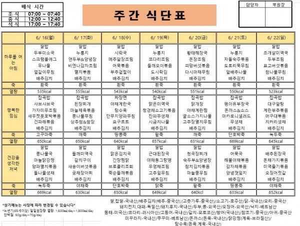 25년 6월 3주 거제요양병원 식단입니다. *클릭하시면 확대 가능합니다. 등록된 댓글이 없습니다.