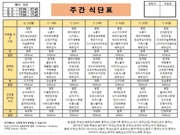 25년 7월 1주 거제요양병원 식단입니다. *클릭하시면 확대 가능합니다. 등록된 댓글이 없습니다.