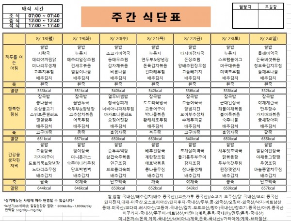 25년 8월 3주 거제요양병원 식단입니다. *클릭하시면 확대 가능합니다. 등록된 댓글이 없습니다.
