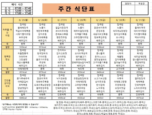 25년 8월 4주 거제요양병원 식단입니다. *클릭하시면 확대 가능합니다. 등록된 댓글이 없습니다.