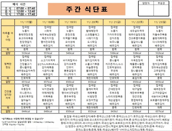 25년 11월 3주 거제요양병원 식단입니다.